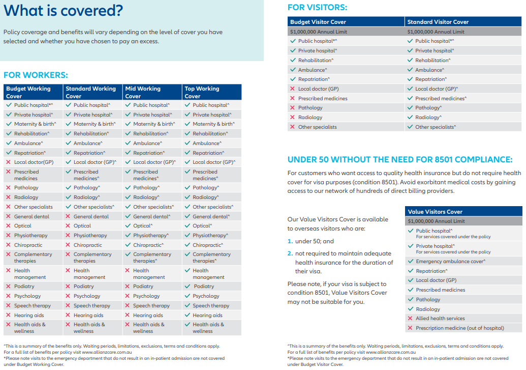 而不同保司针对不同签证的 OVHC 产品,在保障范围、保额上差异较大。以适配 485 签证的 Allianz “Working Cover” 系列为例,小U整理出一份不同版本的产品特点如下,可根据自身医疗需求进一步选择: