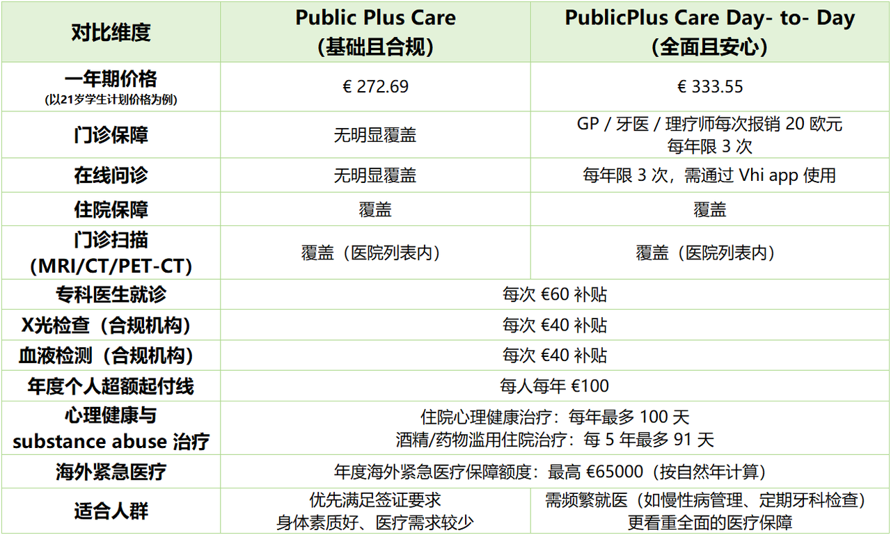 Vhi 的医保计划覆盖移民局要求,且保障灵活,小U这里整理了2类产品的核心信息对比,帮你快速找到适配款: