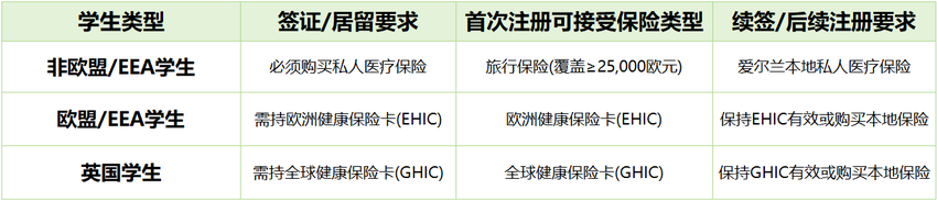 小U温馨提示:欧盟/欧洲经济区学生可以凭借本国的欧洲健康保险卡(EHIC) 或英国的全球健康保险卡(GHIC)在爱尔兰享受公共医疗服务,无需额外购买私人医保;而非欧盟学生即使在爱尔兰参加了公共医疗计划,也仍需购买私人医保以满足签证要求。